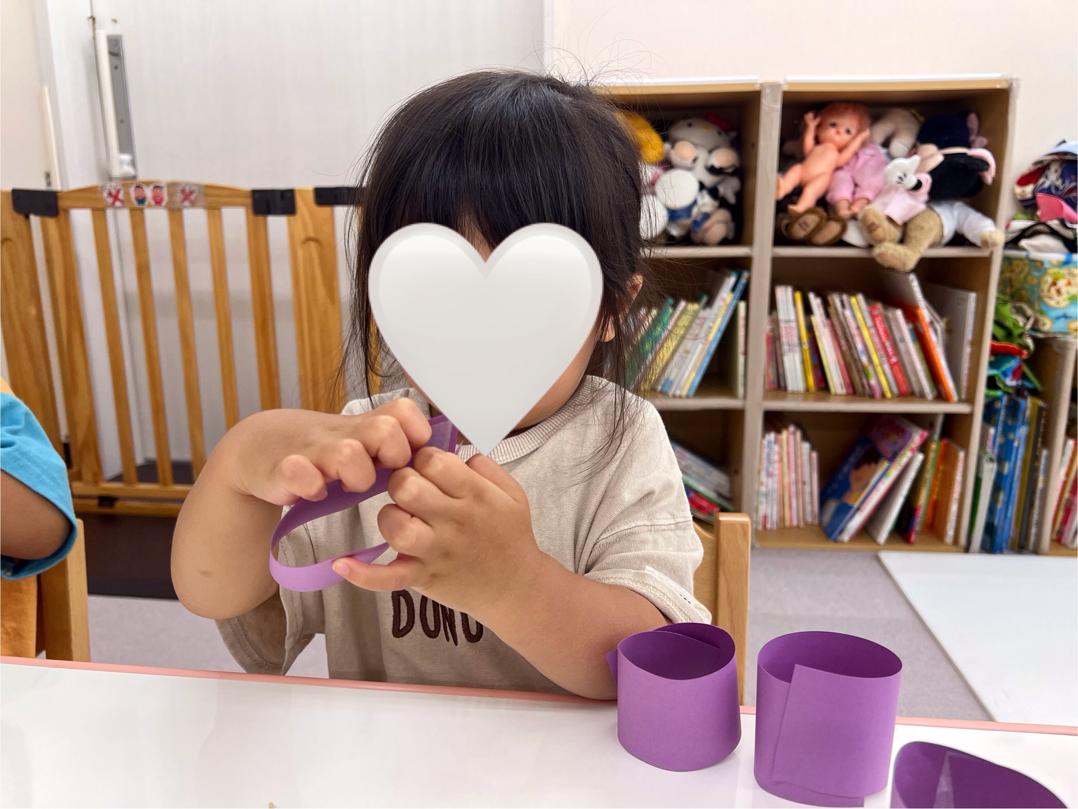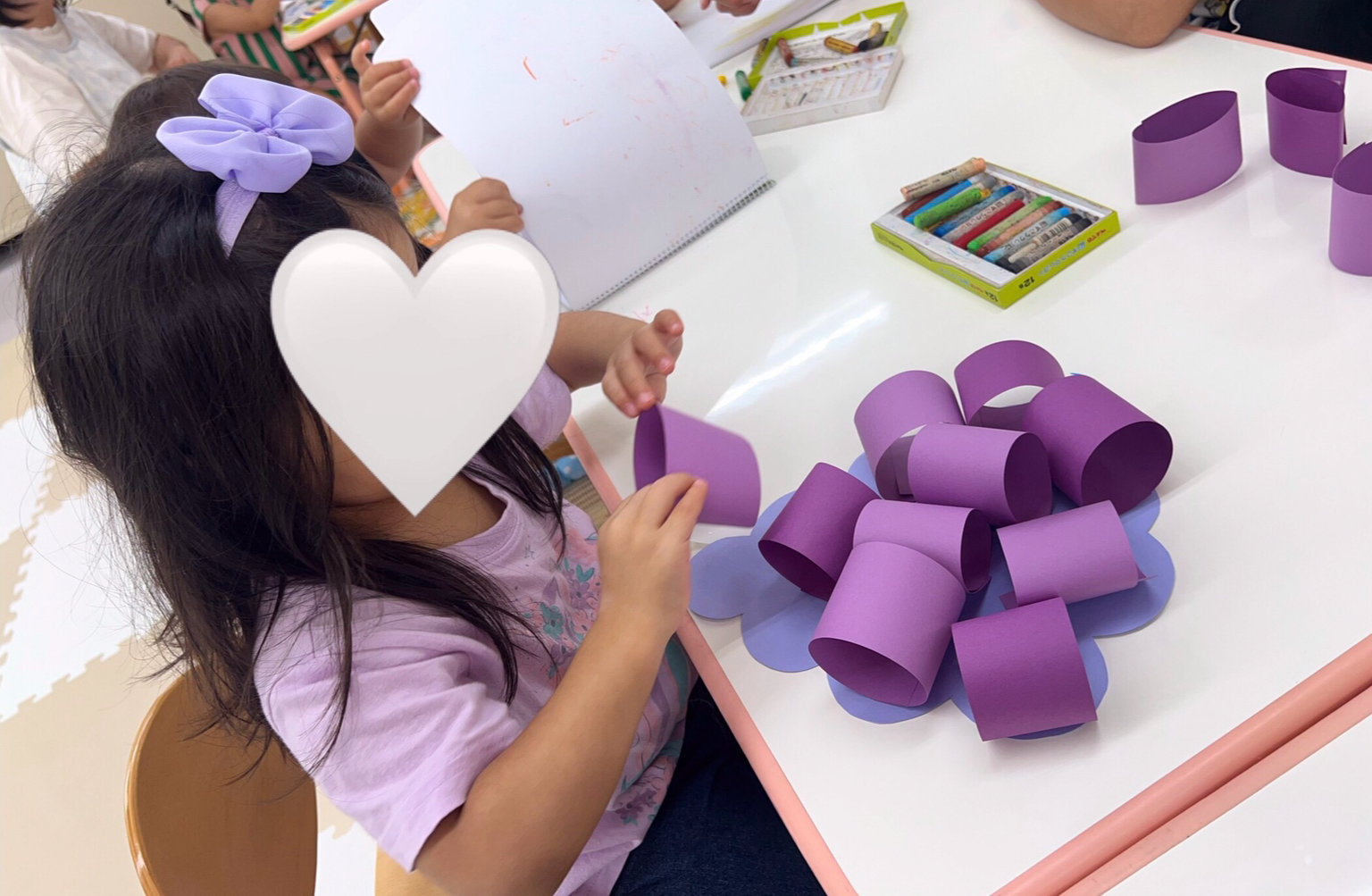 色画用紙を丸い形にするのに苦戦していた子ども達ですが、「こうかな?」と考えながら作成し、やり方が分かると嬉しそうに沢山作っていました😊