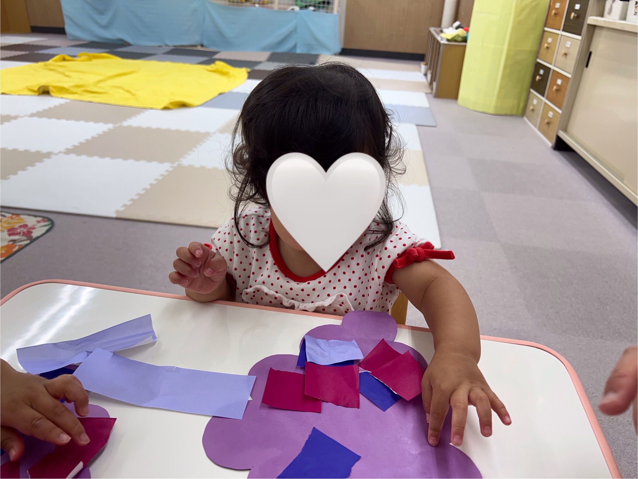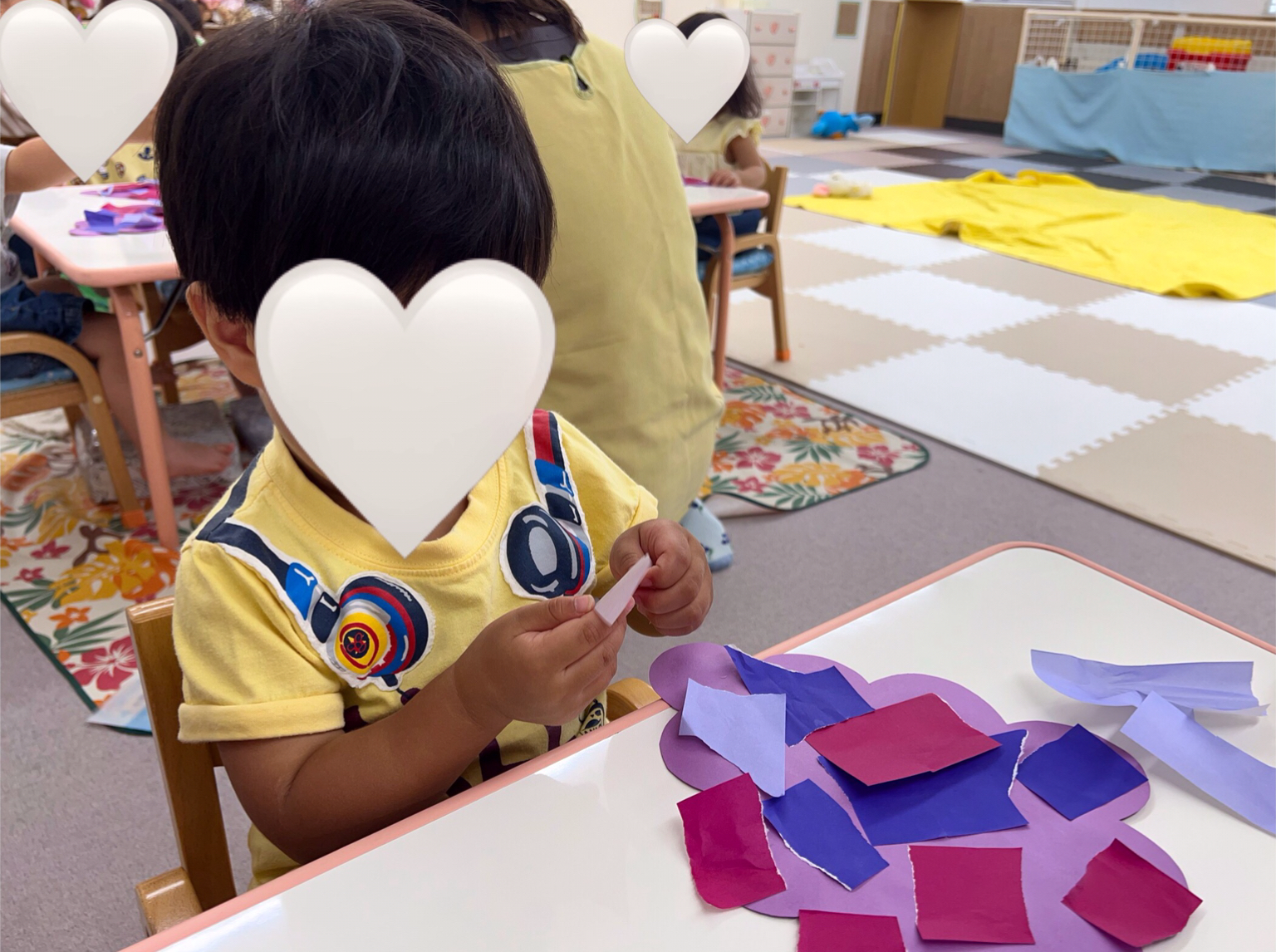 少し切れ目の入ったところから上手に両手でちぎり、「ビリビリッ」という音が楽しくて何枚もちぎって貼っていた子ども達です😊