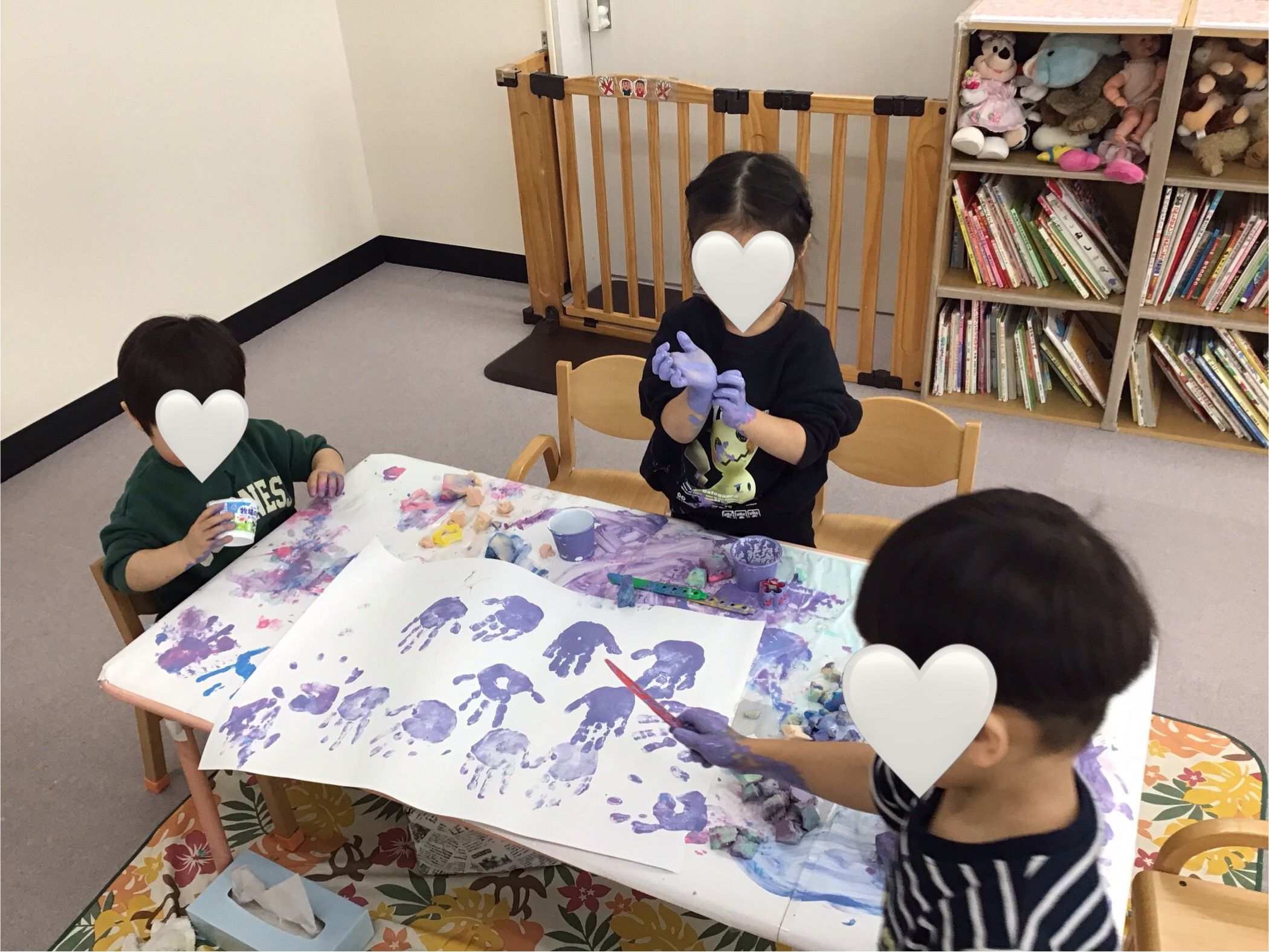 スタンプで使った絵の具を手にぬりぬりして手形のスタンプ!